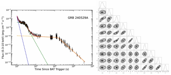 图2. 左图:GRB 240529A的XRT(黑色)光变曲线。右图:GRB 240529A的XRT光变曲线的参数约束。
