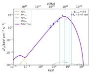 在 Wang et al. (2024) 的研究中,我们构建了参数化的 GRB 结构化喷流模型,并探讨了混合喷流茧(MJC)区域中剪切加速电子的辐射。研究表明,在正轴观测下,剪切加速电子与喷流核心激波加速电子的同步辐射(Syn)和同步自康普顿辐射(SSC)相互叠加,可成功解释某些GRB瞬时辐射的能谱特征。