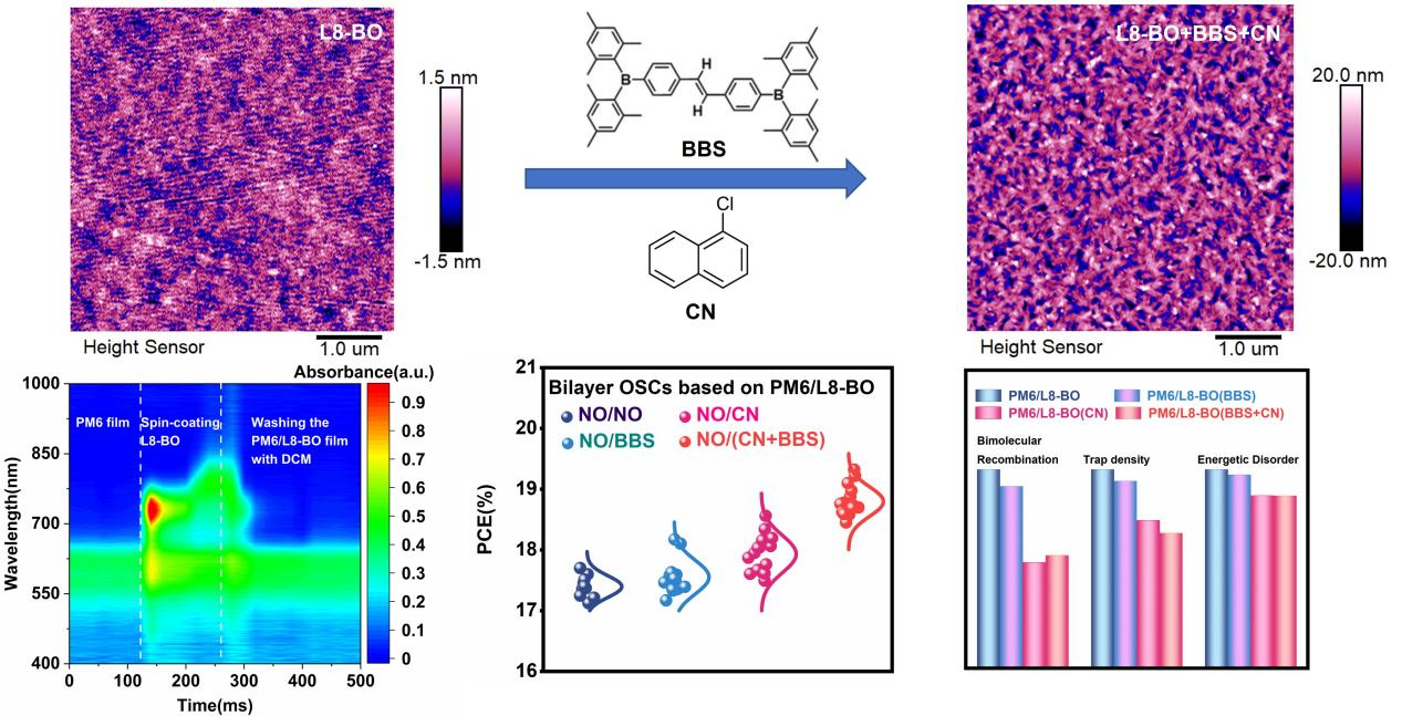 针对以上问题,裸聊直播薄膜光伏研究团队使用“固-液混合添加剂”策略,有效调节双层结构中非富勒烯受体(NFAs)分子的堆积,从而改善NFAs分子的排列有序性。我们观察到,当L8-BO薄膜使用溶剂添加剂1-氯萘(CN)处理时,通过J-聚集增加了结晶度,从而实现了分子的边缘取向和纤维状网络结构。在将固体添加剂反式-双(二甲基苯基硼)苯乙烯(BBS)进一步加入L8-BO溶液后,其中BBS是一种具有多发射位点的荧光有机硼衍生物,它有助于L8-BO分子的紧密有序堆积,改善了薄膜的有序性,并形成了絮状结构。随后,与PM6配对通过顺序旋涂法制备了双层OSCs,以研究器件性能与形貌诱导的分子有序性之间的关系。结果显示,参考器件的PCE仅为17.70%,而加入CN后,性能提升至18.56%,这主要归因于填充因子(FF)的显著变化。进一步加入BBS,FF和短路电流密度(JSC)进一步增加,实现了19.32%的PCE,这是双层器件中最高的值之一。我们将器件性能的提升归因于减少的缺陷复合,从而提高了电荷提取和分离效率。而且,形貌的变化也引起了优异的性能稳定性,当1500h的储存时间后,仍然维持了初始效率的91%。这项研究的结果揭示了双添加剂对NFAs形貌的调制作用,对于实现高效的双层有机光伏电池影响深远。