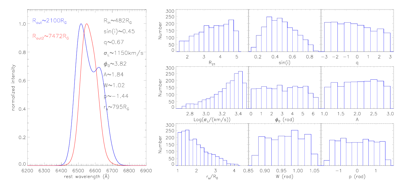 Fig.1 Left panel shows an example on the broad Hα with double-peaked profile (in blue) expected by the circular accretion disk plus spiral arms model with smaller outer radius, but with single-peaked profile (in red) expected by the model with larger outer radius. The right panels show distributions of the applied model parameters leading to double-peaked profiles changed to single-peaked.