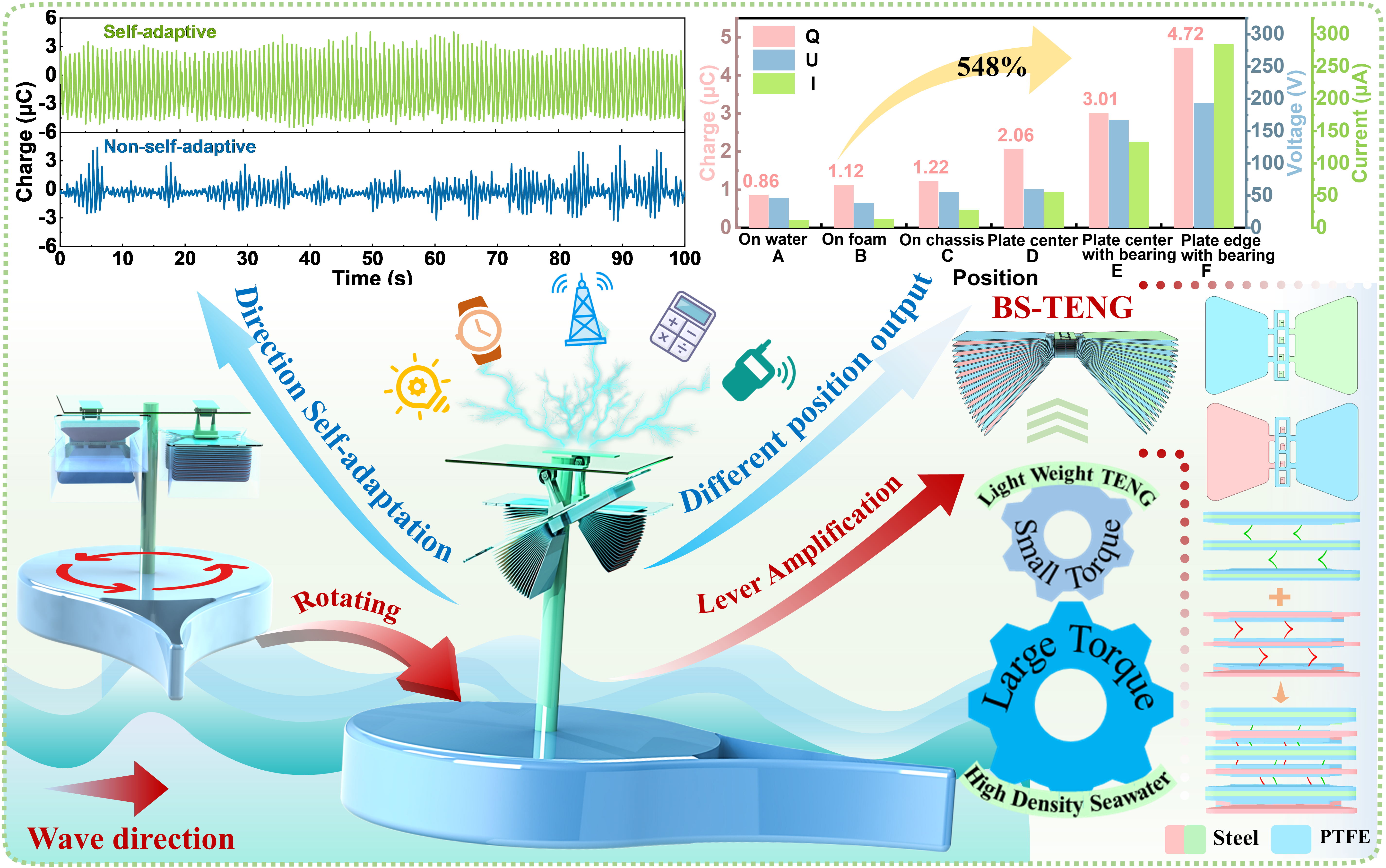 为了解决以上问题,裸聊直播蓝色能源团队设计了基于自适应平台的仿生向日葵方向调整策略以及相应的新型蝶形堆叠摩擦纳米发电机(Butterfly-stacked triboelectric nanogenerator, BS-TENG)。该系统不仅可以在无额外电力消耗下自动调整自适应平台朝向使其对准波浪方向,从而使悬挂其上的BS-TENG高效捕获波能。还利用了杠杆原理将低振幅、高扭矩的波浪能转化为高振幅、低扭矩的动能,从而使致密摩擦层能够充分地接触分离,在弱波条件下与直接漂浮水面的BS-TENG相比,基于自适应平台的BS-TENG电荷输出提高了548%,显著提高了能量利用率。BS-TENG由半覆膜激光蚀刻的Si-Mn 弹簧钢板制成,消除了内部布线、框架和惯性质量。这种超轻设计简化了制造和材料消耗,实现了6.75 cm²g-1的质量摩擦面密度(SSA)。系统研究了该平台的工作机理和输出特性,单个BS-TENG的最大转移电荷量达到了13.68 μC,并证明了有效收集弱波能量为多个电子设备供电的可行性。该策略可与各种收集波浪能的TENG 轻松集成,为弱波浪能收集提供了一种可扩展且经济高效的解决方案。