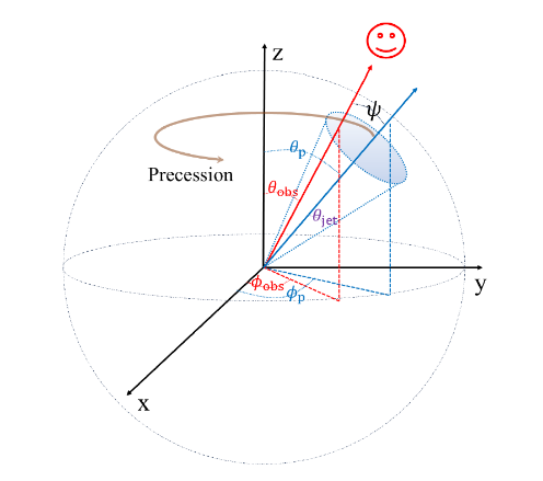 该研究聚焦于伽马射线暴中喷流进动现象的动力学演化,揭示了其并非以固定周期进行,而是受到回落吸积过程与中心黑洞协同演化的深刻影响。该模型表明,喷流进动周期在早期回落阶段会快速下降,随后由于吸积盘表面物质的向外扩散而近乎线性增长,这种独特的演化模式直接导致了光变曲线中脉冲间隔与脉冲宽度随时间逐渐增大的观测特征。研究通过拟合GRB 171126AGRB 211129A等多脉冲暴的光变曲线,论证了喷流进动模型的解释能力,并指出进动周期的绝对值和增长速率敏感地依赖于吸积盘的粘滞参数、厚度比、黑洞质量与自旋以及回落物质的总质量等关键参数,而系统的几何构型则主要调制了脉冲的幅度。